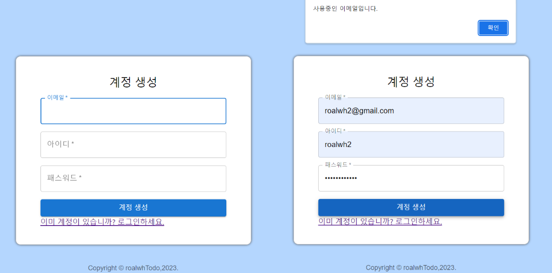 - 회원 가입 페이지 및 사용중인 이메일 알